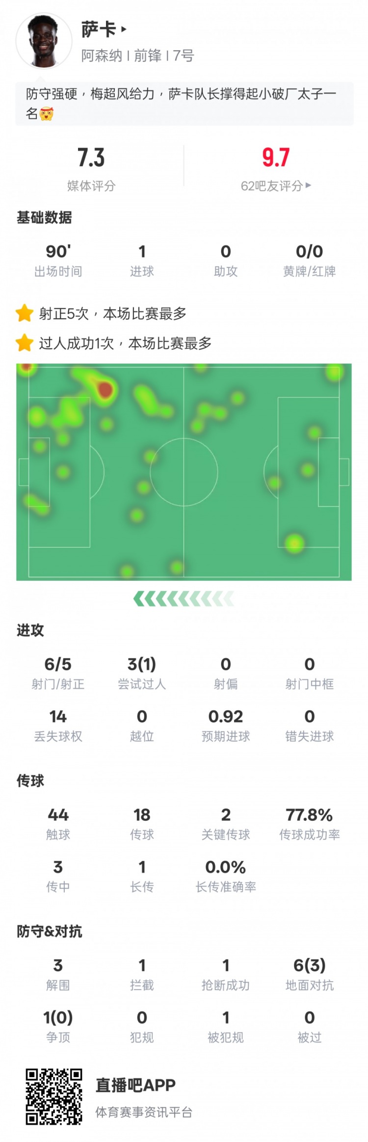 萨卡本场比赛数据:1进球2关键传球1过东谈主告捷,评分7.3